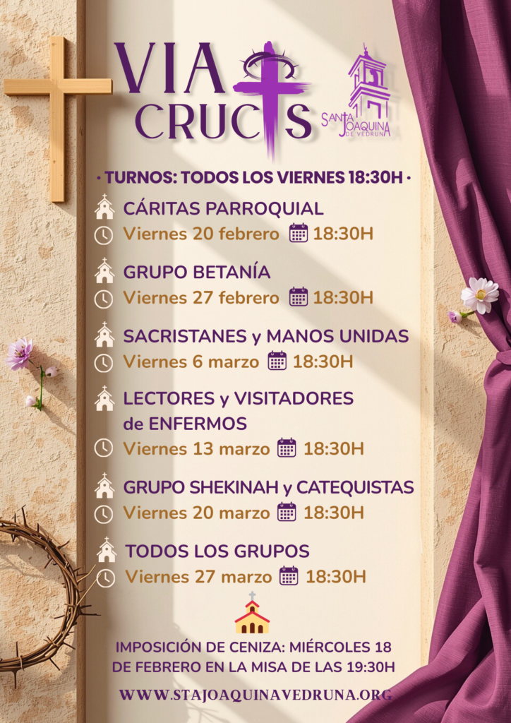 Te animamos a reservar estos ratos en tu agenda y a vivir la Cuaresma en familia parroquial, caminando junto a Jesús paso a paso. Cada Vía Crucis, preparado con cariño por un grupo distinto, será una oportunidad para detenernos, rezar con calma y dejarnos tocar por el amor de Dios en medio de nuestras ocupaciones de cada día.