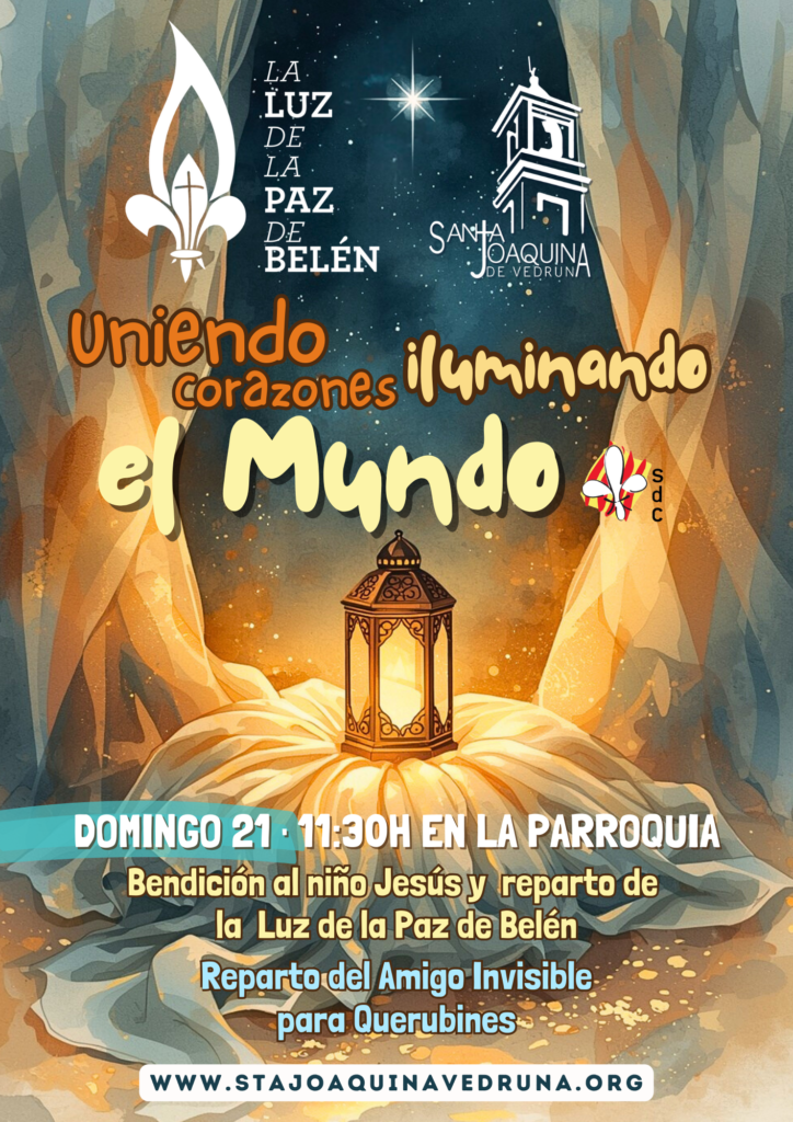 Este domingo 21 a las 11:30 h, te invitamos a la parroquia para vivir una celebración muy especial: la bendición del Niño Jesús y el reparto de la Luz de la Paz de Belén, un signo que nos recuerda que la luz de Cristo se extiende desde Belén a todos los rincones del mundo como símbolo de paz y esperanza.